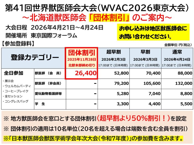 【訂正】第41回世界獣医師会大会(WVAC2026東京大会)北海道獣医師会「団体割引」のご案内(締切:2025年11月28日(金)着金分まで)