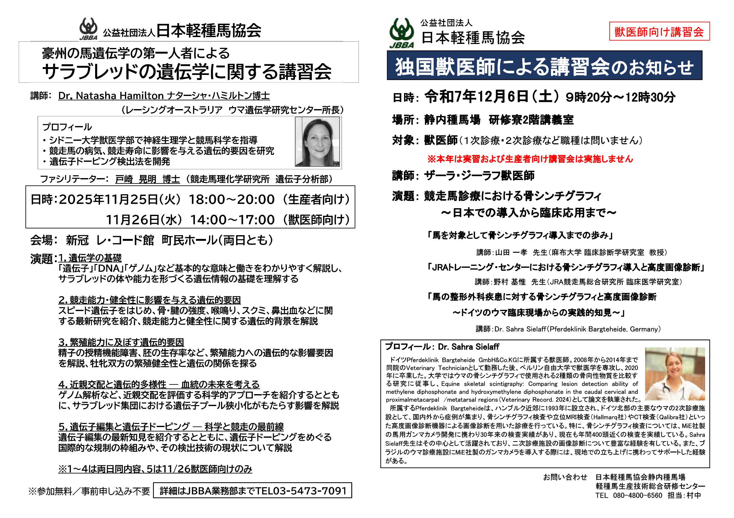 【イベント情報】を更新しました。 サラブレッドの遺伝学に関する講習会の開催案内(獣医師向け:2025年11月26日(水)) 独国獣医師による講習会(獣医師向け)の開催案内(開催:2025年12月6日(土)) 下記リンクをご参照ください。 イベント情報 サラブレッドの遺伝学に関する講習会の開催案内(獣医師向け:2025年11月26日(水)) 独国獣医師による講習会(獣医師向け)の開催案内(開催:2025年12月6日(土))