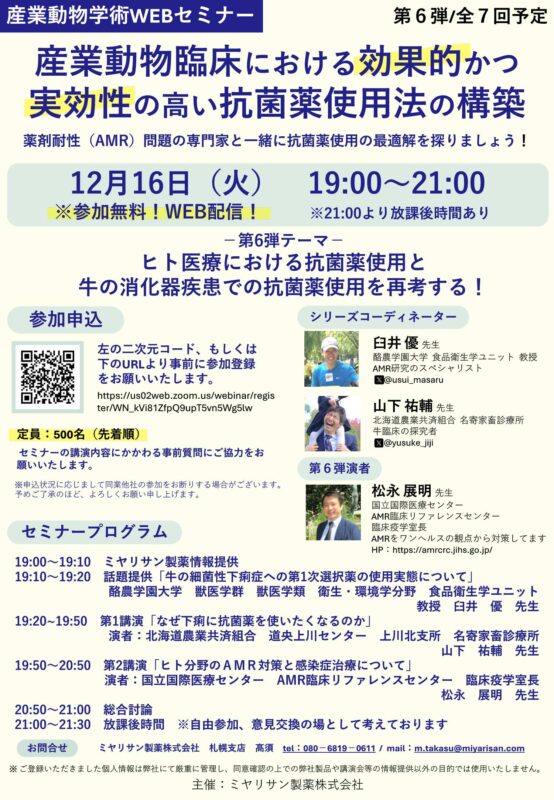 【イベント情報】を更新しました。 ミヤリサン製薬 産業動物学術WEBセミナー「産業動物臨床における効果的かつ実効性の高い抗菌薬使用法の構築」第6弾の開催案内(開催:2025年12月16日(火)) 下記リンクをご参照ください。 イベント情報 ミヤリサン製薬 産業動物学術WEBセミナー「産業動物臨床における効果的かつ実効性の高い抗菌薬使用法の構築」第6弾の開催案内