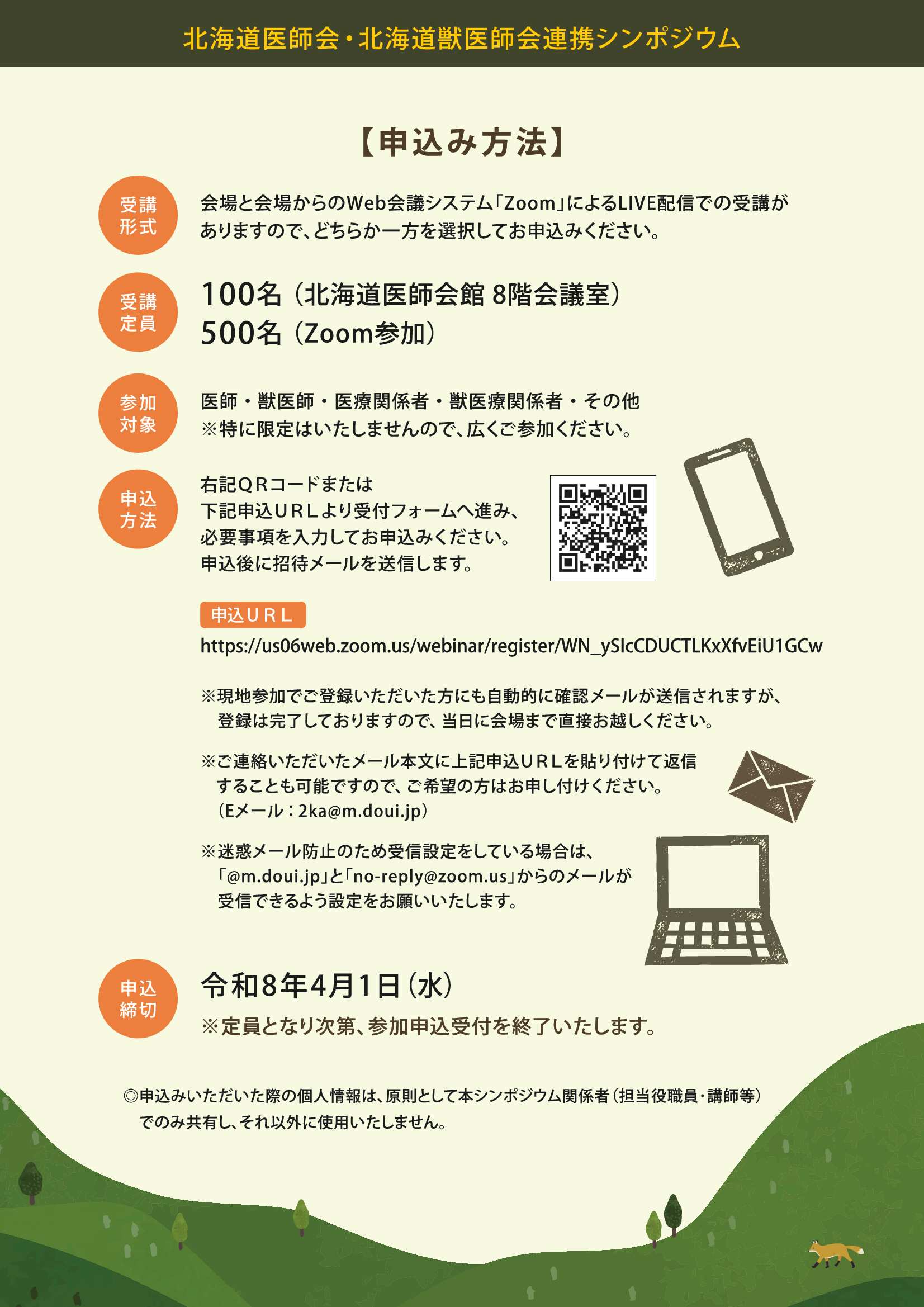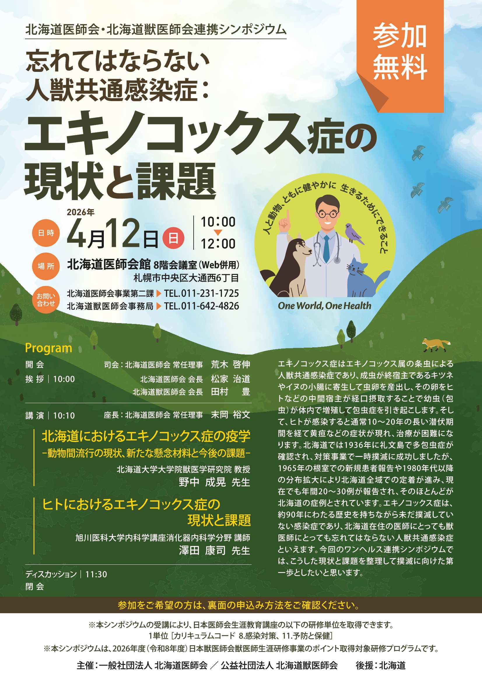 【イベント情報】を更新しました。 北海道医師会・北海道獣医師会連携シンポジウム(開催:令和7年4月12日(日)、締切:令和7年4月1日(水)) 下記リンクをご参照ください。 イベント情報 北海道医師会・北海道獣医師会連携シンポジウム(開催:令和7年4月12日(日)、締切:令和7年4月1日(水))