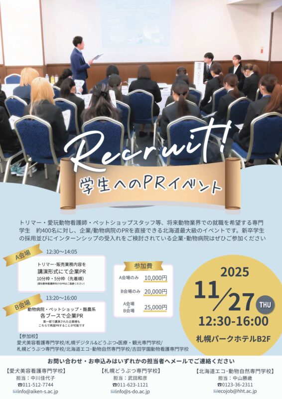 トリマー・愛玩動物看護師・ペットショップスタッフ等、将来動物業界での就職を希望する専門学生約400名に対し、企業/動物病院のPRを直接できる北海道最大級のイベントです。新卒学生の採用並びにインターンシップの受入れをご検討されている企業・動物病院はぜひご参加ください。