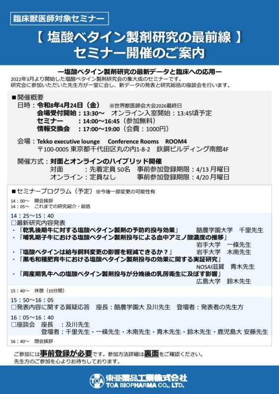 【イベント情報】を更新しました。 東亜薬品工業【塩酸ベタイン製剤研究の最前線】セミナーの開催案内(開催:令和8年4月24日(金)、対面締切:令和8年4月13日(月)) 下記リンクをご参照ください。 イベント情報 東亜薬品工業【塩酸ベタイン製剤研究の最前線】セミナーの開催案内(開催:令和8年4月24日(金)、対面締切:令和8年4月13日(月))