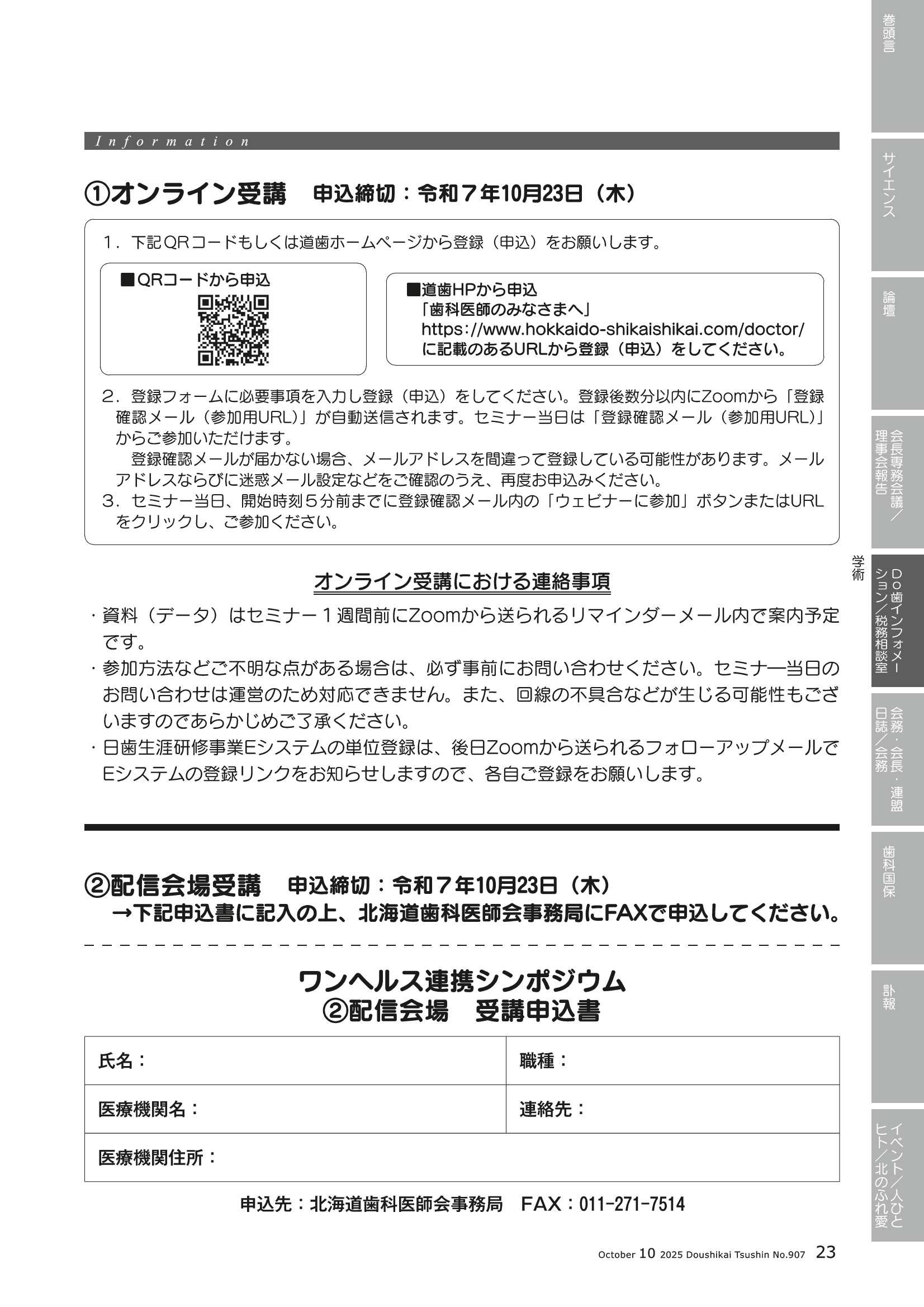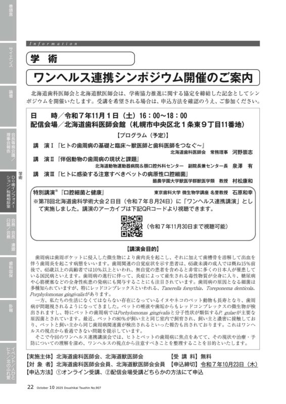 【再掲載】【イベント情報】を更新しました。 北海道歯科医師会ワンヘルス連携シンポジウムの開催案内(開催:令和7年11月1日(土)締切:令和7年10月23日(木)) 下記リンクをご参照ください。たくさんのご参加をお待ちしております。 イベント情報 北海道歯科医師会ワンヘルス連携シンポジウムの開催案内(開催:令和7年11月1日(土)) ※申込締切:令和7年10月23日(木)