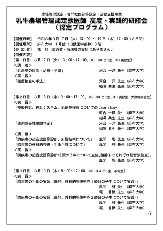「農場管理認定獣医師 高度専門的・実践的研修会」の開催について(乳牛/麻布大学)(7日獣発第85号/令和8年2月5日))
