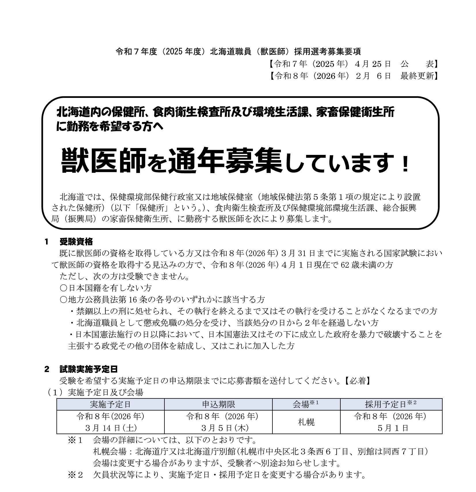 【獣医師募集】を更新しました。 令和7年度(2025 年度)北海道職員(獣医師)採用選考募集要項(3月追加試験)について(申込期限:令和8年3月5日(木)) 下記リンクをご参照ください。 獣医師募集 令和7年度(2025 年度)北海道職員(獣医師)採用選考募集要項(3月追加試験)について(申込期限:令和8年3月5日(木))