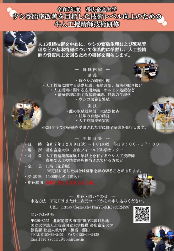 帯広畜産大学「ウシ受胎率改善を目指した技術レベル向上のための牛人工授精師技術研修」受講者募集(開催:令和7年12月9日(火)~ 10日(水))