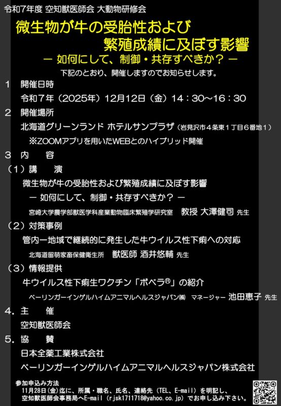 開催:令和7年12月12日(金)空知獣医師会産業動物講習会(市民公開講座)の開催案内(締切:令和7年11月28日(金))