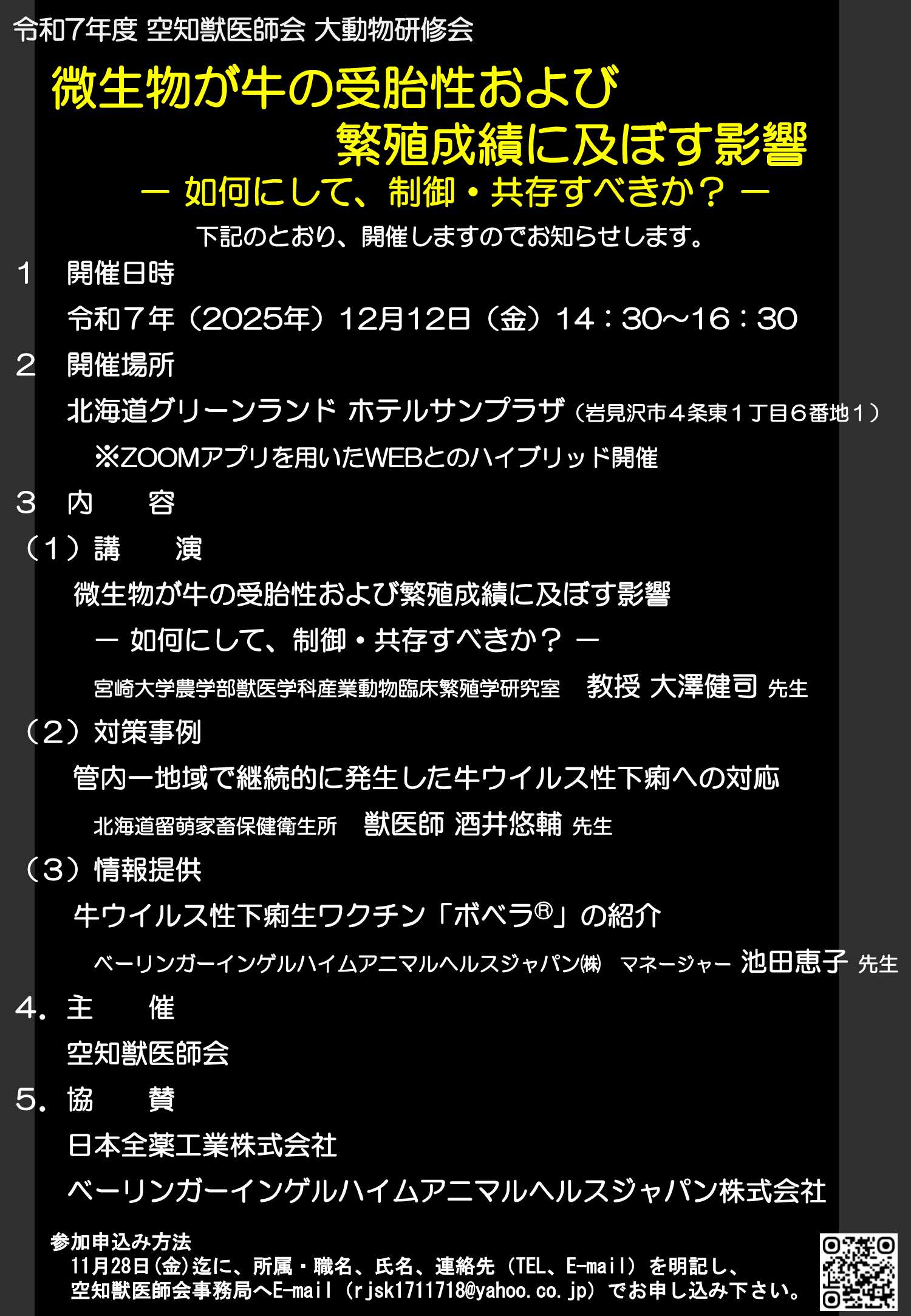 6.申込み:令和7年11月28日(金)迄に、所属・職名、氏名、連絡先(TEL、E-mail)を明記し、空知獣医師会事務局へ申し込みください